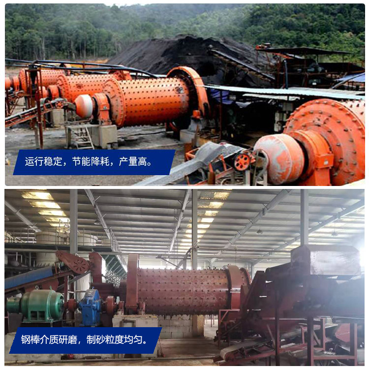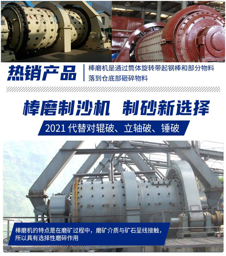 二、出料均勻產(chǎn)量高——采用先進的可控進出料棒磨機技術(shù),結(jié)合實際用戶的研磨物料配用合適的研磨體,一改傳統(tǒng)球磨機的面接觸為線接觸,使制砂機的出料粒度更為均勻、產(chǎn)量更高, 適用于不同硬度(莫氏硬度 5.5 ~ 12 )的礦石。